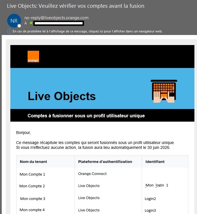 At Orange, we are committed to simplifying and enhancing your user experience. As part of this effort, users with multiple login credentials for the liveobjects.orange-business.com portal can now unify them to enable smoother and more secure navigation on our platform. This evolution aligns with our goal to make your interactions with Live Objects even more straightforward and efficient. It will also facilitate the broader adoption of multi-factor authentication (MFA) on the platform, thereby strengthening the security of your data and connections.