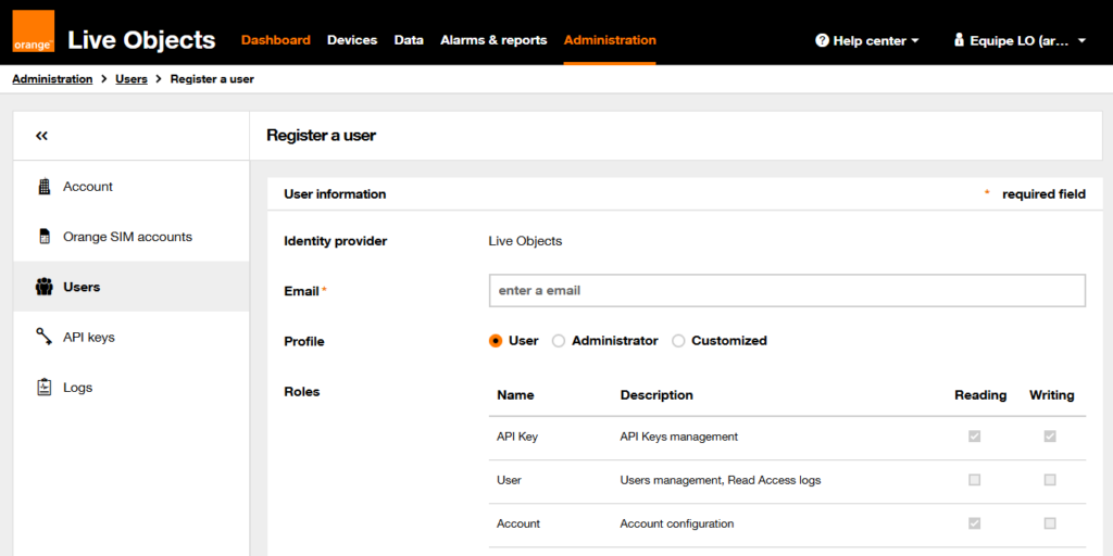 - Add access: ask your Live Objects account administrator to add a new access with your profile’s email address.