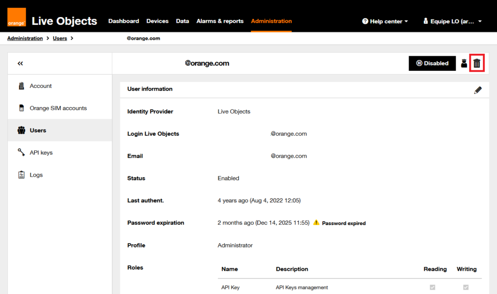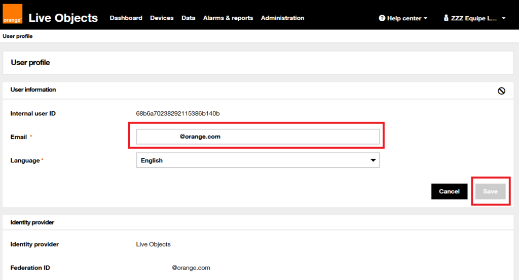 To do so, simply change the email address of the relevant profiles. Please note that this operation is only possible if the profile is authenticated via Live Objects. If you connect through the ECE portal or Orange Romania, contact Live Objects technical support.